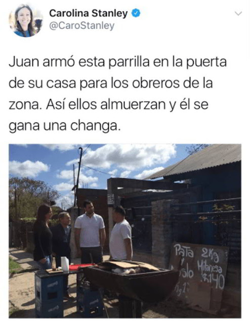 Arrancó temprano la Ministra de Desarrollo Social, Carolina Stanley, festejando públicamente que “Juán armó una parrilla en la puerta de su casa para los obreros de la zona. Así ellos almuerzan y él se gana una changa“. Juán no solo vende sandwiches, sino que también comercia pata y muslo y milanesas caseras, por lo que el tweet de la Ministra es una fiesta para los controles de bromatología y evasión tributaria de la municipalidad de Escobar, que difícilmente dejen pasar la parrilla de Juán en su próxima recorrida por el lugar.