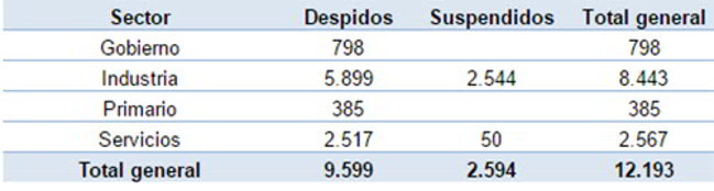 En términos generales, al 31 de marzo de 2017 se contabilizan 253.967 despidos y suspensiones (Tabla N° 1 del informe). Los despedidos ascienden a 212.004 y los suspendidos a 41.963 casos. Dentro de ellos, los despidos del sector privado ascienden a 136.656 y las suspensiones suman 41.933 (Tabla N° 5 del informe).