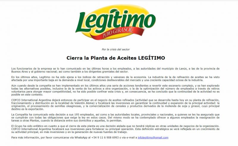 CERRÓ LA FÁBRICA DE ACEITES “LEGITIMO” Y DESPIDIÓ A SUS 195 TRABAJADORES