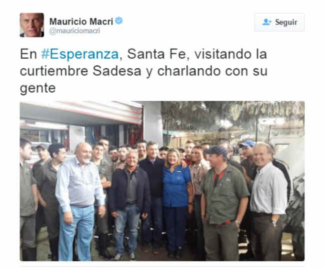 La empresa había recibido la visita de Mauricio Macri el pasado de septiembre, mientras éste se encontraba en plena campaña electoral. “En #Esperanza, Santa Fe, visitando la curtiembre Sadesa y charlando con su gente”, había posteado el ahora Mandatario en la red social twitter por aquellos días.