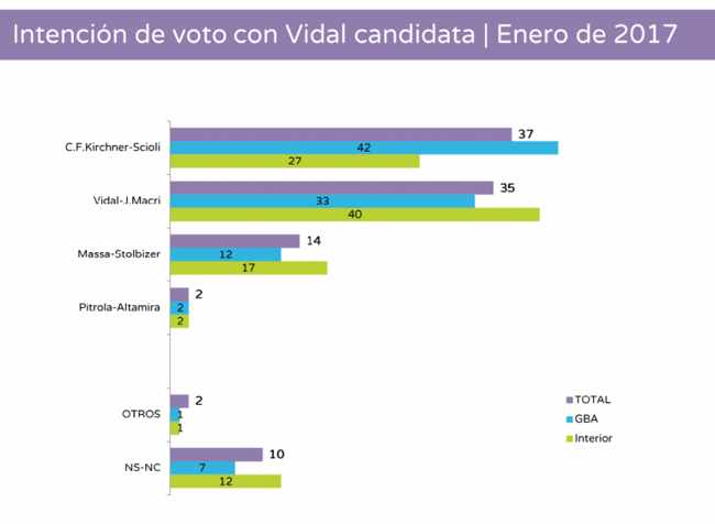 Vidal sigue siendo la mejor candidata de Cambiemos en la provincia de Buenos Aires, y luego de un año mantiene los votos obtenidos de octubre de 2015 sobre Aníbal Fernández. La duda de la mayoría de los consultores es saber si esta elección se resuelve por nombres o se vota por la política económica llevada a delante por el gobierno nacional. Hoy el gobierno de Macri solo tiene una aprobación del 32% en la provincia de Buenos Aires. Si fuera este último punto la diferencia sería mayor entre peronismo y oficialismo.
