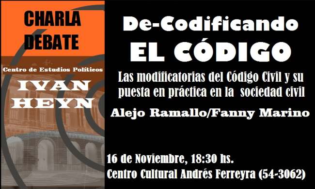 El Centro de Estudios Políticos Ivan Heyn tiene el agrado de invitar a toda la comunidad a la charla denominada “De-Codificar el Código. Vivir lo cotidiano con las herramientas adecuadas.” La misma tendrá lugar este 16 de noviembre a las 18:30 hs., en las instalaciones del Centro Cultural Andrés Ferreyra, ubicado en calle 54-3062. Dicho encuentro estará a cargo del doctor Alejo Ramallo y de la trabajadora social Fanny Judith Marino, y tiene por objeto abordar las modificatorias del Código Civil y su puesta en práctica en la sociedad civil, trabajando los cambios en el imaginario colectivo y como los saberes desde lo cotidiano han atravesado su contexto viendo y sintiendo que la De-Codificación del Código es posible aun sin ser expertos en la norma.