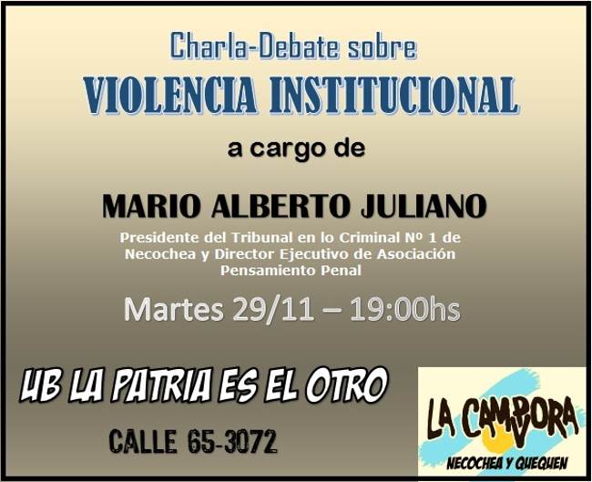 La Cámpora Necochea y Quequén, tiene el agrado de invitar a la Charla/Debate sobre Violencia Institucional a llevarse a cabo este martes 29 de noviembre a las 19:00 hs. La misma tendrá lugar en la Unidad Básica La Patria es el Otro, ubicada en calle 65-3072 y estará a cargo del Juez Mario Alberto Juliano, quien desempeña sus funciones como presidente del Tribunal en lo Criminal Nº 1 de Necochea, siendo además, Director Ejecutivo de Asociación Pensamiento Penal.