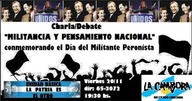 La Cámpora Necochea y Quequén, tiene el agrado de invitar a toda la la comunidad a la Charla/Debate denominada «Militancia y Pensamiento Nacional», en conmemoración del Día del Militante Peronista. El encuentro se realizará en la Unidad Básica «La Patria es el Otro», ubicada en calle 65-3072, el día viernes 20 de noviembre a las 19:30 hs.