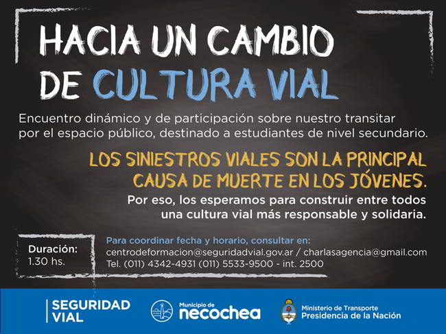 En el marco de una campaña del “derecho a la vida”, y por disposición del intendente Dr. Facundo López, el martes y miércoles que viene se desarrollarán charlas de educación vial en instituciones educativas del Distrito y en el Salón de Actos municipal, tanto para alumnos y docentes, que a nivel nacional se están dando desde el Ministerio de Transporte.