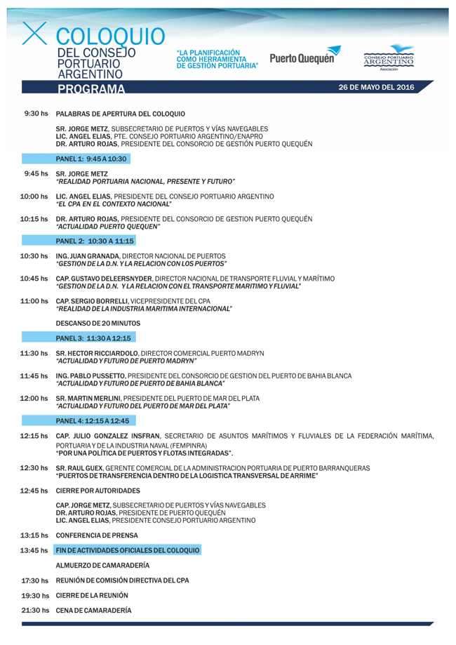 También disertarán el Director Comercial de Puerto Madryn, Héctor Ricciardolo; el Presidente del Consorcio del Puerto de Bahía Blanca, Ing. Pablo Pussetto; el Presidente del Puerto de Mar del Plata, Martín Merlini; y el Gerente Comercial del Puerto Barranqueras, Raúl Guex.