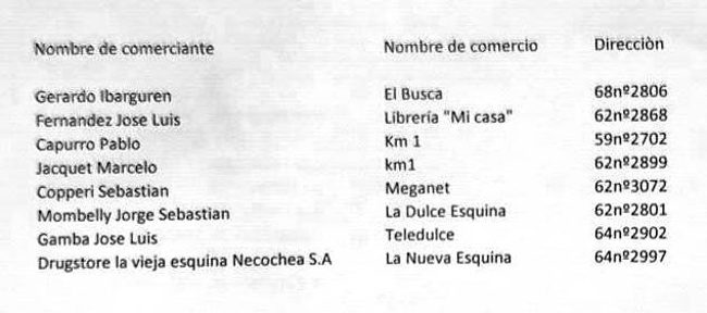 Por ahora tenemos 8 comercios que van a vender a partir de hoy el crédito para el estacionamiento medido, anunció el secretario de Gobierno Diego López Rodríguez. Los comercios hasta el momento adheridos están todos ubicados en el centro de la ciudad y son: El Busca (68 Nº 2806), Librería Mi Casa (62 Nº 2868), KM 1 (dos sucursales: av 59 Nº2702 y 62 Nº 2899), Meganet (62 Nº 3072), La Dulce Esquina (62 Nº 2801), Teledulce (64 Nº 2902), y La Nueva Esquina (64 Nº 2997).