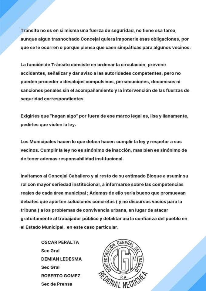 La CGT Regional Necochea repudió las declaraciones del concejal libertario Eduardo Caballero, al considerar que evidencian desconocimiento del rol y las funciones del área municipal de Tránsito y una falta de respeto hacia las y los trabajadores municipales.
