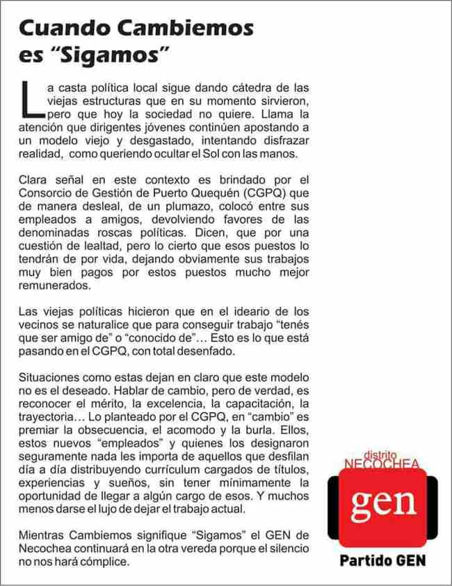«Hablar de ‘cambio’ es reconocer el mérito, la excelencia, la capacitación y la trayectoria y no colocar a amigos dentro de los empleados, devolviendo favores de las denominadas ‘roscas’ políticas», afirman los representantes del GEN en Necochea.