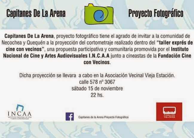 Este sábado 15 de noviembre a las 22hs se proyectará el corto que se realizara como producto de la jornada de trabajo «Taller de cine exprés con vecinos». La misma fue una experiencia de realización cinematográfica llevada adelante por la Fundación Cine con Vecinos en conjunto con INCAA.