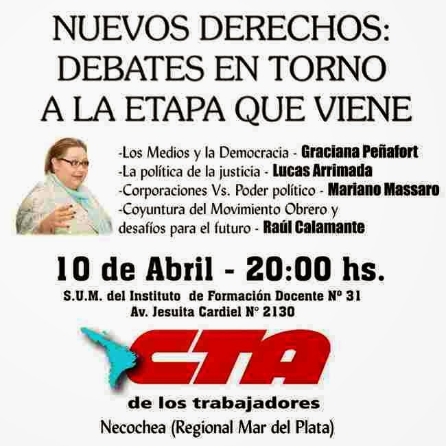 El día Viernes 10 de Abril se desarrollará la jornada «Nuevos Derechos: debates en torno a la etapa que viene», organizada por la CTA de los Trabajadores Necochea (Regional Mar del Plata).