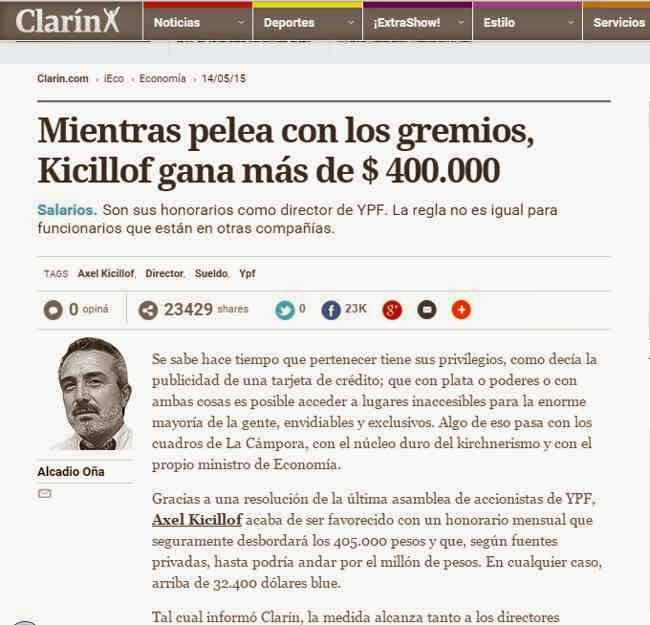 El pasado día Jueves 14 de Mayo el «gran diario argentino» publicó una nota en la que afirmaba, con un tono escandalizador, que el Ministro de Economía Axel Kicillof percibe un honorario mensual de más de $400.00 como director de YPF. La noticia fue repetida durante todo el día por el resto de los medios pertenecientes al Grupo Clarín.
