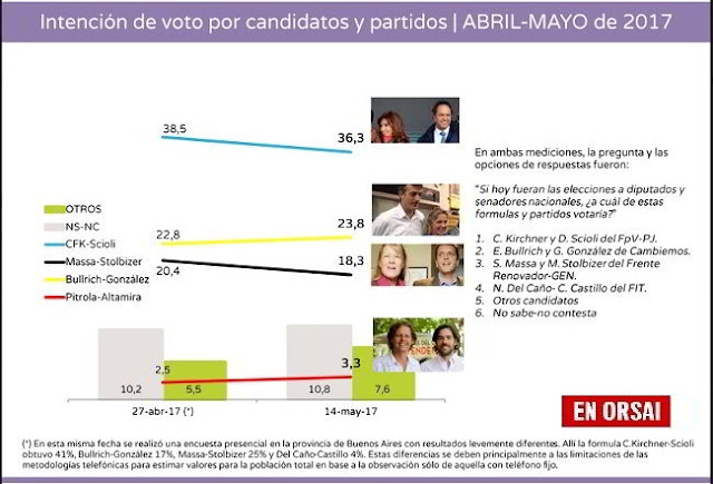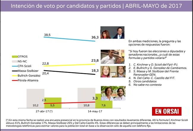 El escenario electoral de la provincia de Buenos Aires al 14 de mayo se mantiene sin cambios relevantes respecto a lo que ya se conoce desde, por lo menos, fines del año pasado: una lista del FpV encabezada por Cristina Kirchner y Daniel Scioli ganarían comodamente la elección, sacándole entre 10 y 15 puntos de diferencia al segundo frente que, según el momento y la metodología usada en la encuesta, puede ser Cambiemos con Esteban Bullrich o el Frente Renovador-GEN con Massa y Stolbizer.