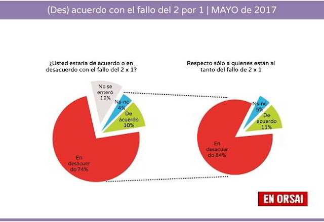 La encuesta también midió el grado de acuerdo y desacuerdo con el fallo del 2 x 1 para liberar genocidas. El resultado fue rotundo: 88% está al tanto del fallo, 74% está en desacuerdo con el mismo y sólo un 10% acuerda con esa decisión.