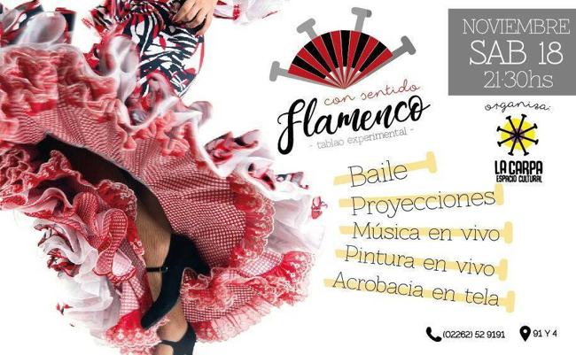 Con Sentido Flamenco, tablao experimental es la nueva apuesta de La Carpa Espacio Cultural de 4 y 91, para este sábado 21.30hs con entrada libre y a la gorra como ya es habitual en el lugar, baile y música tradicional flamenca fusionada con acrobacia en telas, textos teatrales y artes visuales.