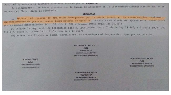 «Confirmar pronunciamiento de grado en cuanto fuera materia de agravios» señala el reciente fallo de la Cámara, donde a su vez imponen costas del juicio y regulación de honorairos a los demandantes (Tesón). Es de destacar que el fallo fue unánime: los tres jueces de Cámara, los Dres. Elio Horacio Riccitelli, Rubén Gerez y Roberto Mora, coincidieron en su decisión.
