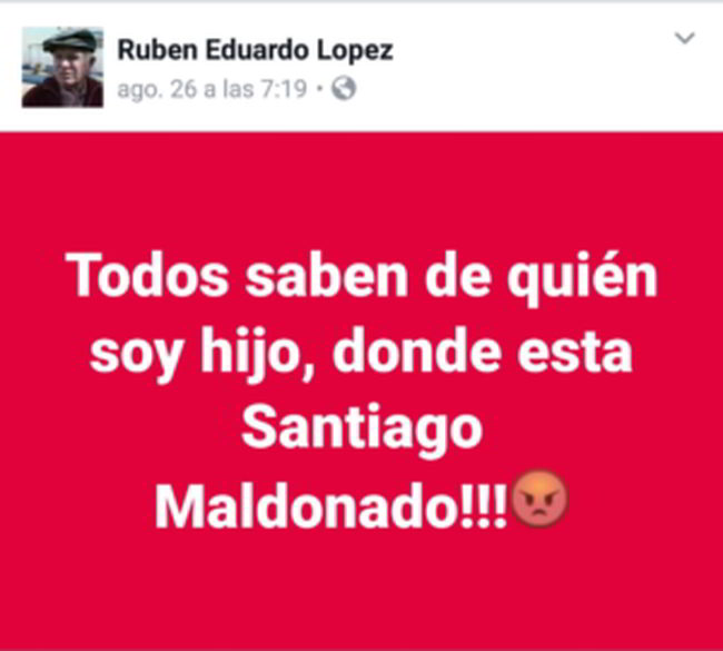 Rubén López posteó en su facebook: “Todos saben de quién soy hijo, dónde está Santiago Maldonado!!!😡”.