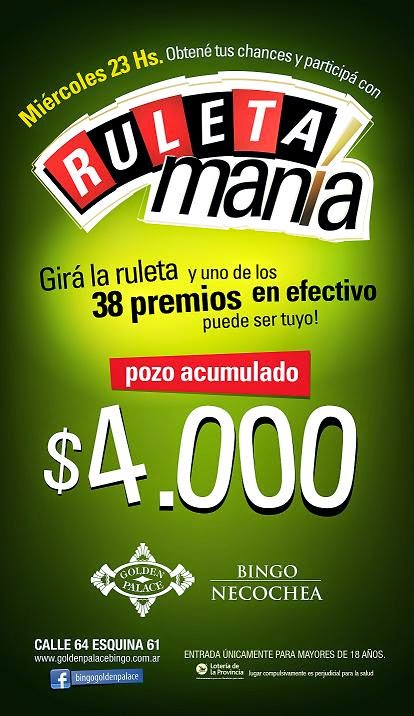 Necochea, Miércoles 26 de Noviembre de 2014.- Hoy, Miércoles 26 de Noviembre a partir de las 23.00 hs, en Bingo Golden Palace continúa la promo “Ruletamanía” con grandes posibilidades de ganar más de $ 4.500 premios en efectivo.