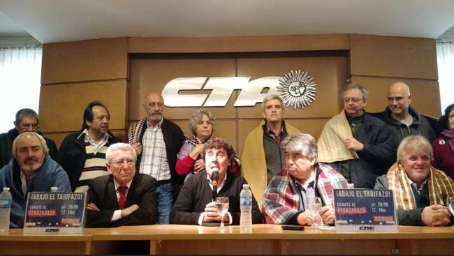 Participaron de la conferencia referentes de las distintas organizaciones que convocan: CTA Autónoma Nacional, CTA de los Trabajadores, Federación de Trabajadores de la Energía de la República Argentina, Proyecto Sur – Senador Fernando “Pino” Solanas, Defensoría de la Tercera Edad CABA, Asociación de Consumidores Libres, Apyme, La Alameda, El Moreno, Attac Argentina, Silcaba, Barrios de Pie, MST, Movimiento Emancipador, Partido Izquierda Socialista, Comisión Salvemos al Tren, Red Nacional contra los Tarifazos, Corriente Nacional Emancipación Sur, Encuentro de los Pueblos, Agrupación Celeste y Blanca Cortadores de Indumentaria.