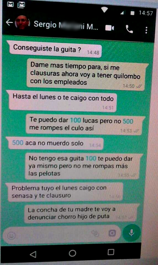 El diálogo, que ya estaría incorporado al expediente judicial (al que nunca nos permitieron acceder) se trataría (usamos el modo potencial por razones obvias, dado que aún no existe una pericia oficial que lo confirme) de un pedido de coimas a un empresario del sector avícola.