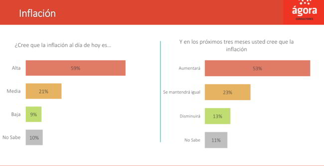 El tema que más preocupa es la inflación con un 59%. Llama también la atención que el 53% considera que seguirá creciendo la inflación, todo lo contrario de lo que afirma el presidente.