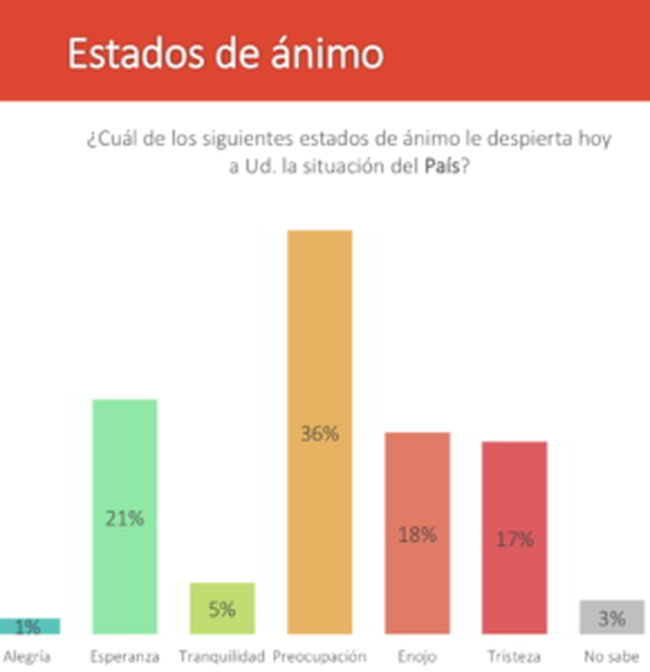 Estos números se reflejan cuando se consulta por el estado de animo. Así un 36% plantea preocupación, un 18% tiene enojo y un 17% tristeza. Solo un1% tiene alegría y un 21% esperanza.