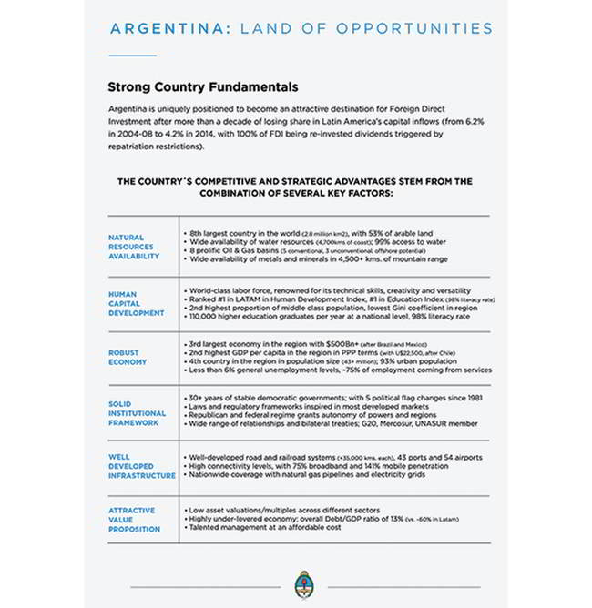 En el mismo sentido, y sobre las verdaderas condiciones de la economía argentina a diciembre de 2015, dan cuenta no sólo los prospectos que figuran en los títulos de deuda emitidos para el pago a los fondos buitre y para el bono de deuda a 100 años, sino también el informe para inversores extranjeros “Argentina: land of oportunities. Strong Country Fundamentals” (adjunto a pie de párrafo), difundido con motivo del Foro de Inversiones y Negocios conocido bajo el nombre de “Mini Davos”, que se celebrara en Buenos Aires entre el 12 y el 15 de septiembre de 2016 y en el que participaran alrededor 67 países y 970 empresas internacionales, entre otras: JP Morgan; Dow Chemical Company; Coca-Cola; Siemens; British Petroleum; Cisco Systems; IBM; Novartis; Lithium Americas Corp; Adecco LATAM; Goldman Sachs; Louis Dreyfus Company.