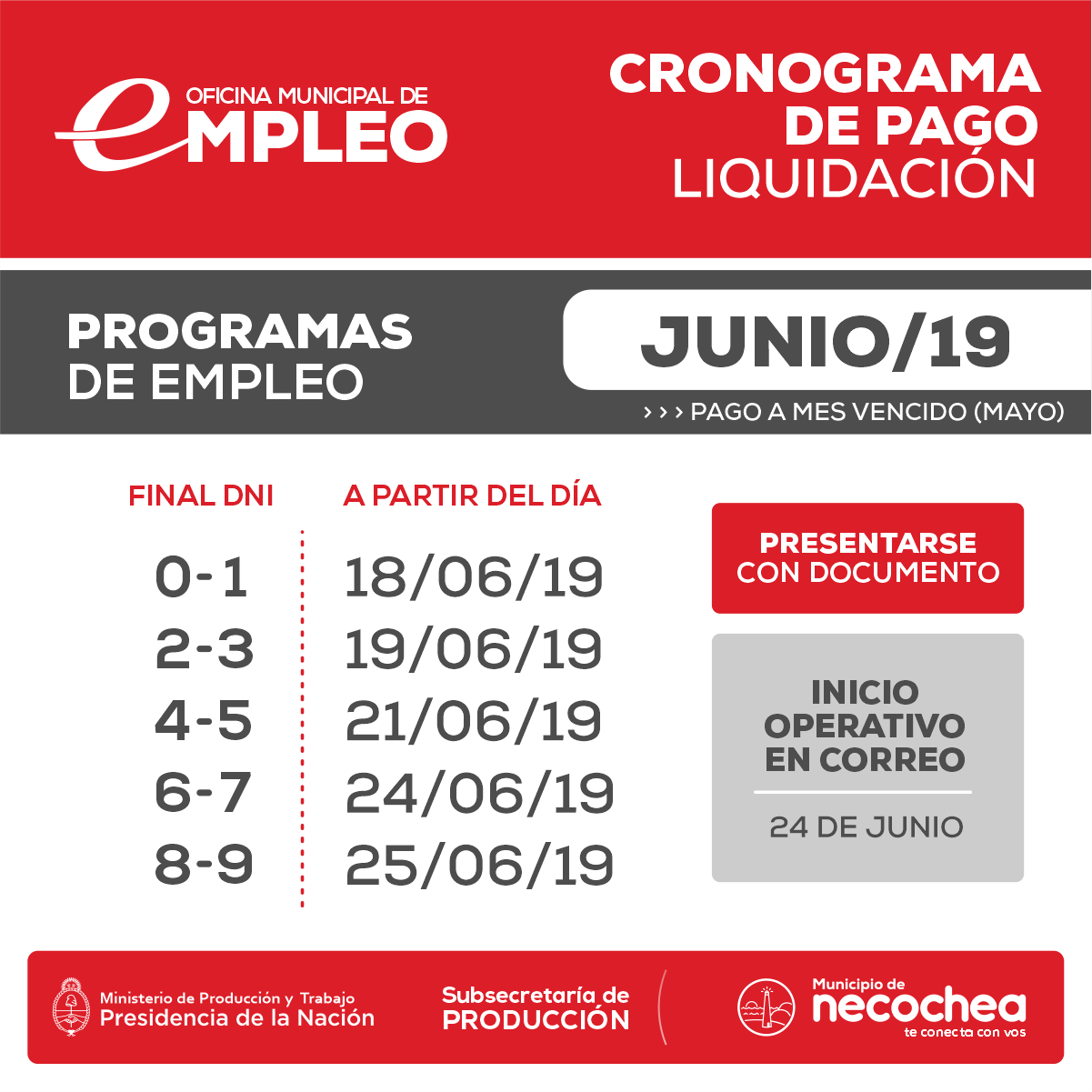 La Oficina de Empleo Municipal informa que la semana próxima dará inicio el operativo de pago de junio, por los programas de Empleo del Ministerio de Producción y Trabajo nacional.