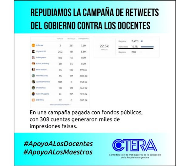 La CTERA repudia enérgicamente la feroz campaña del Gobierno Nacional contra los maestros argentinos efectuada por 300 “trolls” que generaron de forma artificial cientos de impresiones del hashtag .