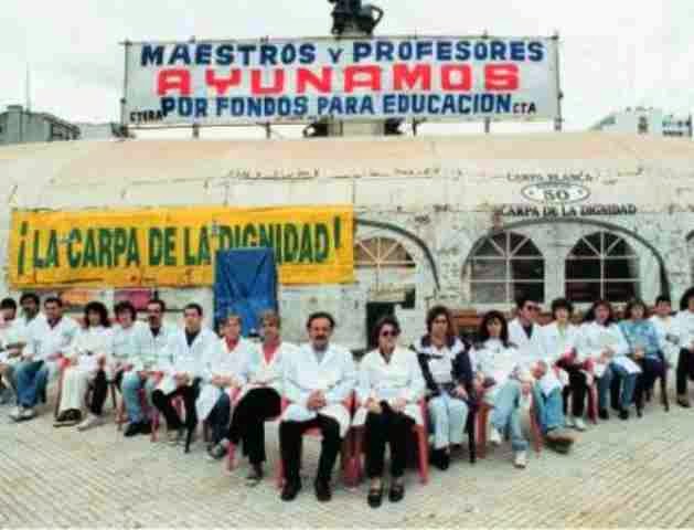 La carpa fue emplazada el 2 de abril de 1997. Aunque el principal motivo de la protesta fue el aumento de los fondos para la educación, los docentes también reclamaron una mayor defensa del mercado interno, políticas productivas y de sustitución de importaciones, y la suspensión del pago de la deuda externa. Durante la larga protesta, la carpa fue visitada por casi 3 millones de personas, incluyendo a 7000 alumnos de escuelas argentinas y recibió el apoyo de diferentes personalidades como Eduardo Galeano, Mercedes Sosa, León Gieco, Alfredo Alcón, familiares de María Soledad Morales y José Luis Cabezas y las Abuelas y Madres de Plaza de Mayo.