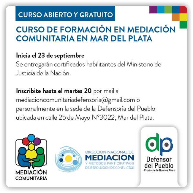 La Defensoría del Pueblo de la provincia de Buenos Aires, organiza un curso de formación en mediación comunitaria, que servirá para la confección del registro de mediadores del organismo.
