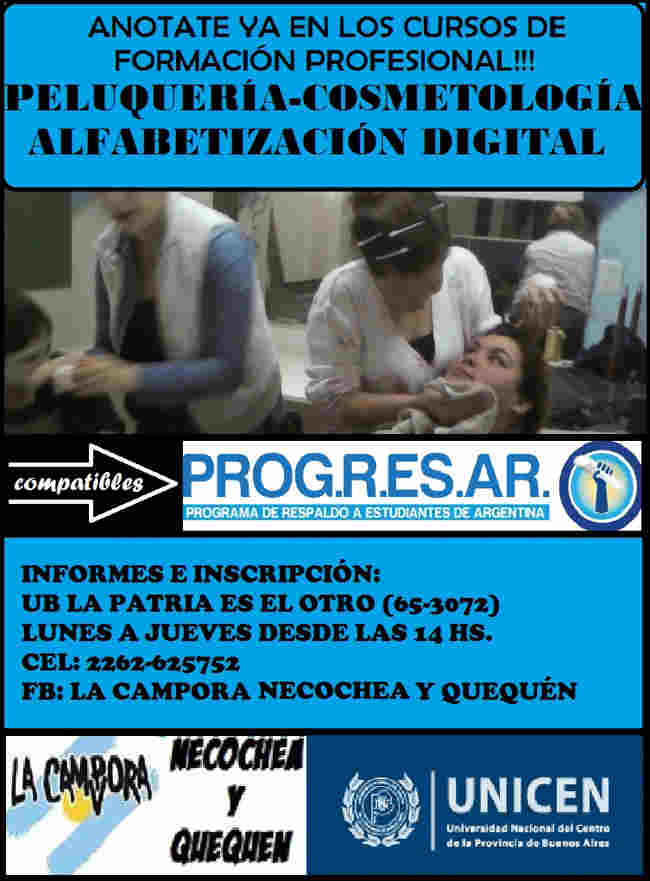 La agrupación La Cámpora de Necochea y Quequén, conducida por la dirigente Andrea Cáceres, anunció la apertura los Cursos de Alfabetización Digital, Cosmetologìa y Peluquería.