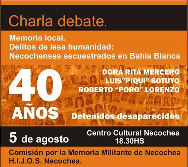 El encuentro es organizado en nuestro medio por H.I.J.O.S Necochea y la Comisión por la Memoria Militante de Necochea al cumplirse el próximo 14 de agosto 40 años del secuestro en Bahía Blanca de los militantes Roberto «Poro» Lorenzo, Dora Rita Mercero y Luis «Piqui» Sotuyo, durante la última dictadura militar. Los responsables de su desaparición fueron juzgados en Bahía Blanca, en el marco de la causa en la que se investigó el funcionamiento del centro clandestino de detención “La Escuelita”.