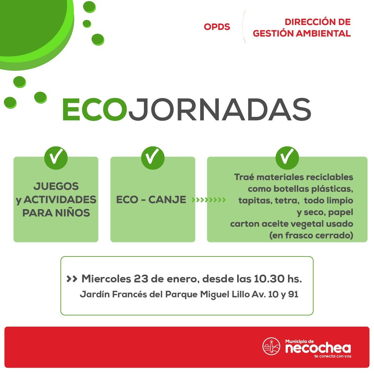 La Dirección de Gestión Ambiental, a cargo de Belén Benavídez, y en trabajo en conjunto con el OPDS, anuncia para este miércoles 23 Eco Jornadas, espacio destinado para la familia en el Jardín Francés del Parque Lillo (10 y 91) entre las 10:30 y las 16.