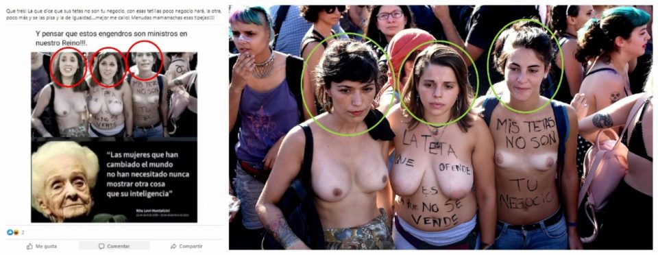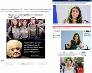 “Y pensar que estos engendros son ministras de nuestro reino!!!!”, reza una publicación junto a una imagen en la que aparecen tres mujeres con los pechos al descubierto y los rostros de la ministra española de Igualdad, Irene Montero; la ministra de Derechos Sociales y Agenda 2030, Ione Belarra, y la exdiputada y exportavoz de Podemos en la Asamblea de Madrid Isabel Serra.