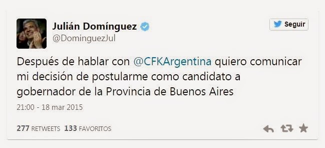 Domínguez, que hasta ahora era junto a Daniel Scioli y Florencio Randazzo uno de los candidatos del oficialismo en las internas del Frente para la Victoria, aseguró desde su cuenta en Twitter que tomó la decisión tras hablar con la presidenta Cristina Kirchner.