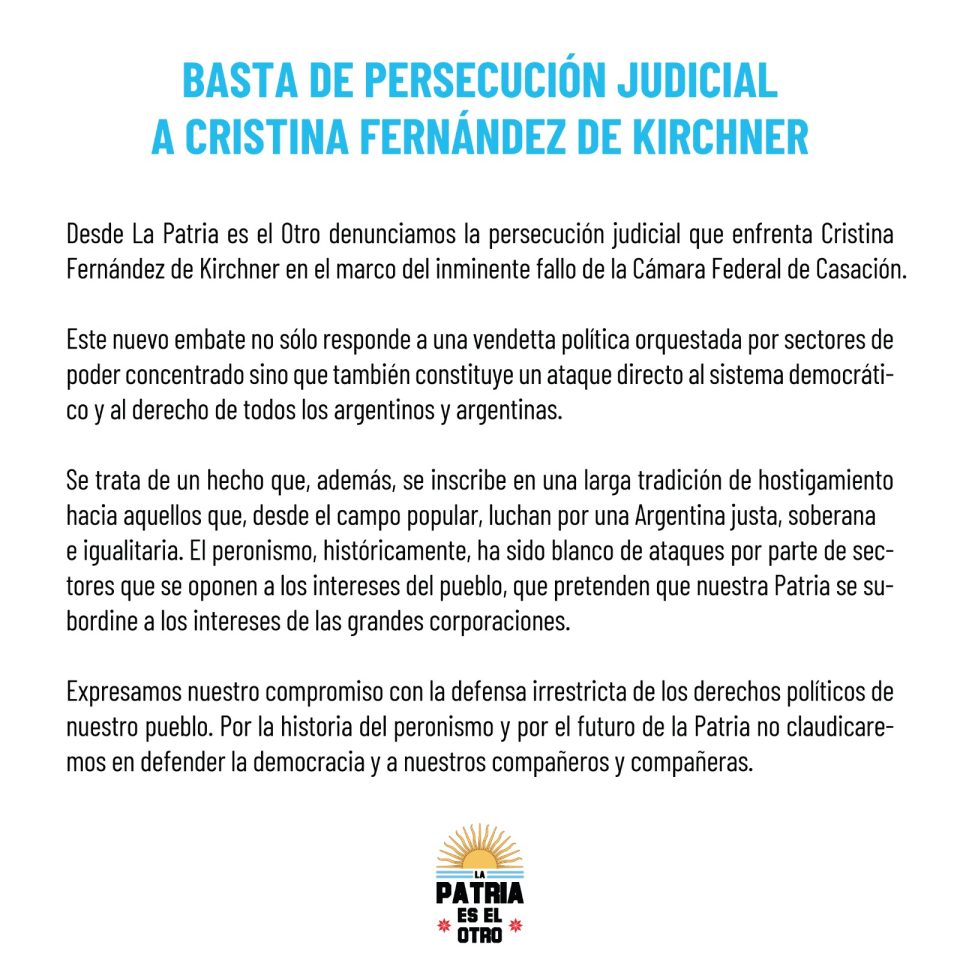 La declaración considera que este nuevo embate judicial es “una vendetta política” que, según sostienen, no sólo afecta a Fernández de Kirchner, sino que también representa un ataque directo al sistema democrático y al derecho de los argentinos y argentinas. La agrupación enmarcó esta situación en lo que considera una larga tradición de hostigamiento hacia figuras populares que abogan por un país justo y soberano.