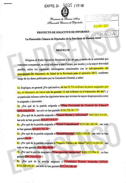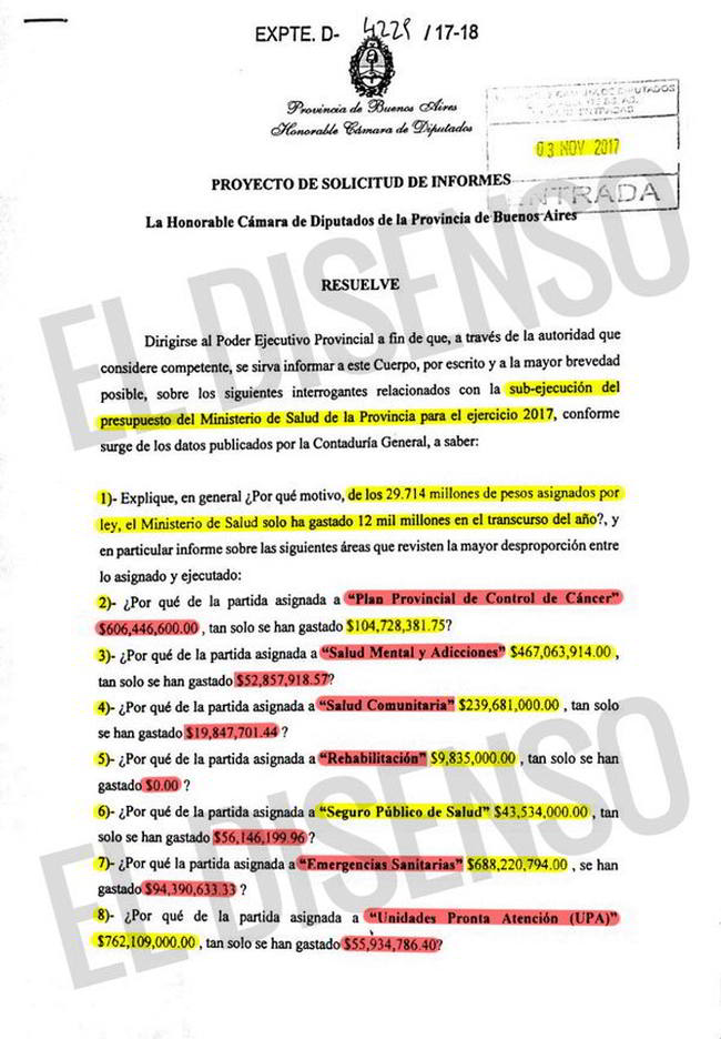 Los diputados del FPV de la Provincia de Buenos Aires realizaron un pedido de informes para que el gobierno de Vidal explique porqué subejecutó nuevamente el presupuesto de salud. Las cifras son escandalosas, de los casi 30 mil millones asignados, Vidal solo utilizó 12 mil millones.
