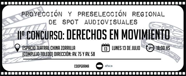 El próximo lunes 13 de Julio de 2015 a las 18hs en el espacio teatral “China Zorrilla” del complejo Toledo (75 y 58) se realizará la proyección y preselección de los spots audiovisuales del concurso para estudiantes secundarios de 15 a 20 años “DERECHOS EN MOVIMIENTO”. Dicho concurso se originó el pasado año en la ciudad de Mar del Plata, siendo ampliado a nivel regional para esta segunda ocasión. En el caso de nuestra subregión han participado escuelas, profesores y estudiantes de Necochea y de San Cayetano, entre los que se seleccionarán 3 spots para la instancia final regional en Mar del Plata cuyos ganadores grabarán en estudio y con equipamiento profesional sus spots al mismo tiempo que serán difundidos por canales de TV abierta las y los ganadores (canal 10 de Mar del Plata entre otros medios).