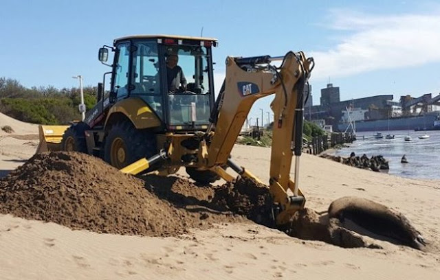 Hasta el momento de realizarse esta nota en 2262.com.ar varios lobos marinos se encuentran graves y no se sabe con certeza todavía si van a sobrevivir y otros tantos perdieron la vida. Una de las máquinas del municipio se hizo cargo de los trabajo de excavación para enterrar a los lobos a orillas de la escollera.