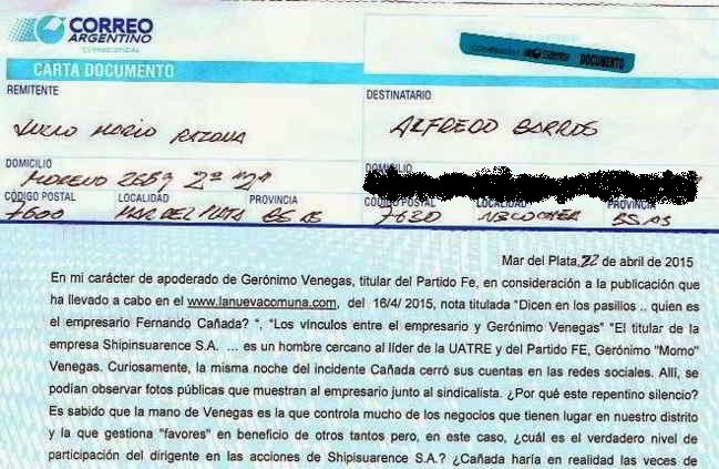 En mi carácter de apoderado de Gerónimo Venegas, titular del Partido Fe, en consideración a la publicación que ha llevado a cabo en el www.lanuevacomuna.com, del 16/04/2015, nota titulada «Dicen en los pasillos…quien es el empresario Fernanado Cañada?»,»Los vínculos entre el empresario y Gerónimo Venegas» «El titular de la empresa Shipinsuarence S.A…. es un hombre cercano al líder de la UATRE y del Partido Fe, Gerónimo «Momo» Venegas. Curiosamente, la misma noche del incidente Cañada cerro sus cuentas en las redes sociales. Allí, se podían observar fotos públicas que muestran al empresario junto al sindicalista. ¿Por qué este repentino silencio?