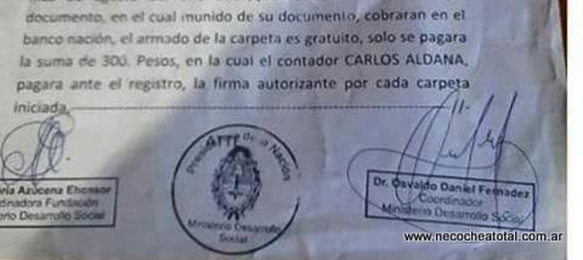 Se detalla que “el armado de la carpeta es gratuito, solo se pagará la suma de 300 pesos, en el cual el contador Carlos Aldana, pagará ante el Registro, la firma autorizante para cada carpeta iniciada”.