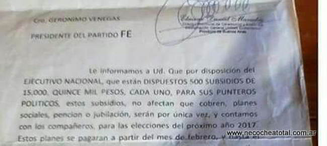 La nota dirigida a Gerónimo Venegas, como presidente del Partido FE, pone en comunicación de esta autoridad partidaria que “por disposición del Ejecutivo Nacional, están dispuestos 500 (quinientos) subsidios de $15.000 (quince mil pesos) cada uno, para sus punteros políticos”, mensualmente.