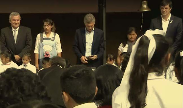 El chico bien del Newman que jamás pisó un establecimiento educativo estatal estuvo acompañado por el primer ministro de Educación Argentino que no es docente y por el Gobernador jujeño que es salteño de nacimiento y tiene en su provincia a la primera presa política del gobierno de Macri. La cálida reunión enmarcada en una treintena de niños de diversa edad con blancos uniformes en un número que dista bastante de los 140 niños matriculados actualmente en la escuela 1725, fue a todas luces otra puesta en escena.