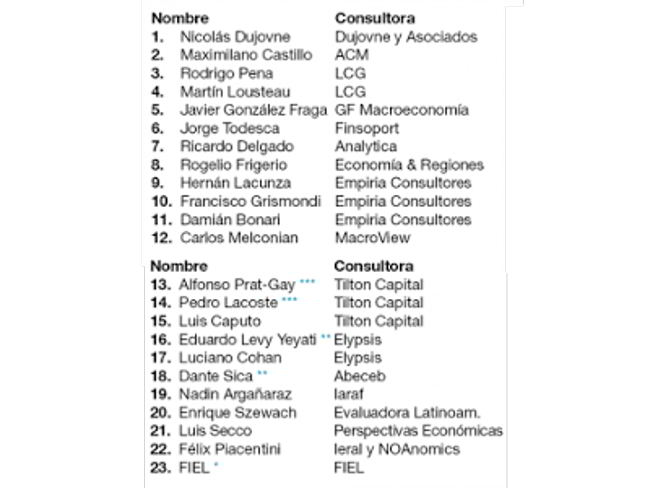 Maximiliano Castillo, de la consultora ACM, es subsecretario de Análisis de Presupuesto en la Jefatura de Gabinete; Jorge Todesca, de Finsoport, maneja el Indec; Nadin Argañaraz, del Instituto Argentino de Análisis Fiscal (Iaraf), es subsecretario de Desarrollo del Ministerio de Hacienda; Félix Piacentini, del Ieral de la Fundación Mediterránea y de la consultora NOAnomics, es Coordinador Provincial de la secretaria de Hacienda.
