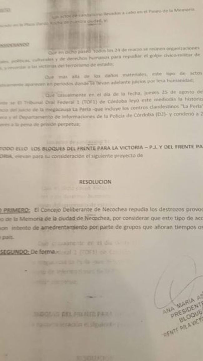 Proyecto de repudio elaborado por el bloque de concejales del Frente Para la Victoria
