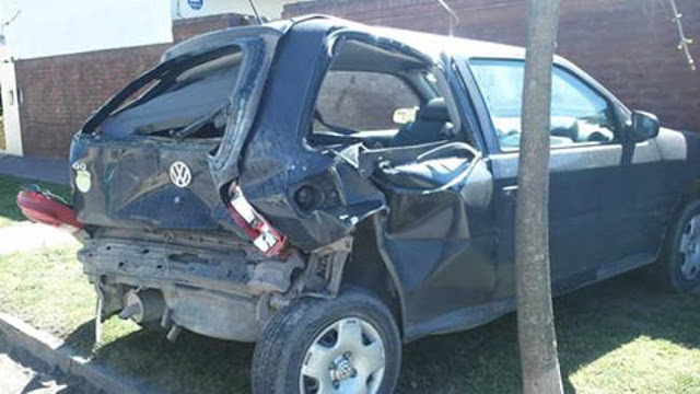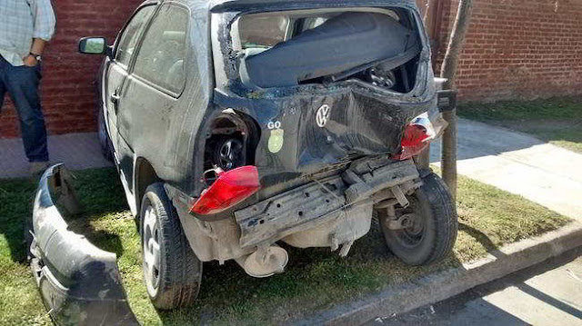 Se trata de un Volkswagen Gol color azul que, según informó Lescano, se encuentra «prácticamente destruido», tanto en su parte delantera como trasera.
