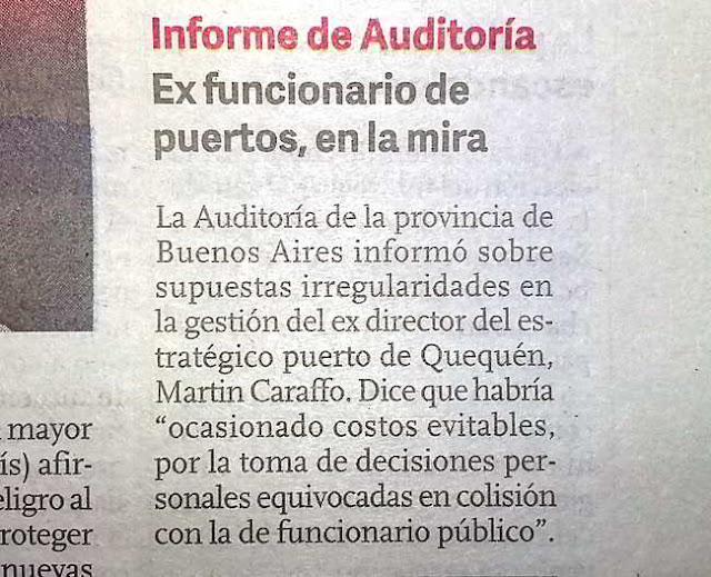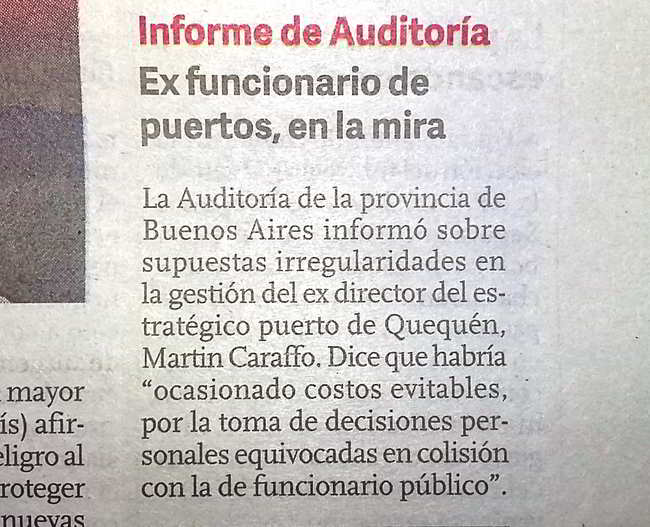 Así da cuenta brevemente el diario Clarín en este lunes 7 de diciembre en su página 19. Según lo que se indica en el periódico (que no se puede tildar como cercano a la administración que finaliza su mandato, sino todo lo contrario), durante el período del abogado Caraffo se habrían producido «costos evitables, por la toma de decisiones personales equivocadas en colisión con la de funcionario público».