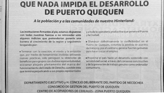 – Terminar con la coacción, el miedo y la extorsión que, por medio de herramientas inválidas utilizando nuevas prácticas, solo persiguen la obtención de beneficios para grupos con dudosa representatividad, acciona alejado plenamente del marco del funcionamiento perjudicando a sus propios representados y a toda la operatoria productiva que genera el Puerto y la Ciudad.