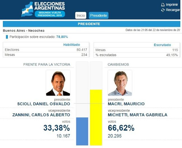 En Necochea y en consonancia con lo sucedido en el paìs, el Ingeniero Mauricio Macri superò al candidato Daniel Scioli, aunque con màs ventaja.